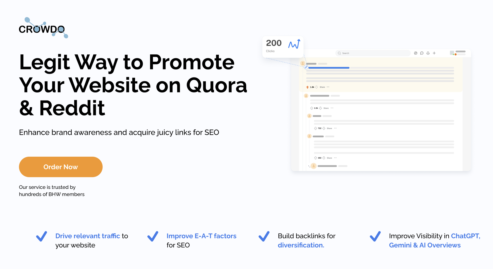 - Real contributions with skillfully woven promos that look natural and improve your SEO, as well as brand and AI visibility.