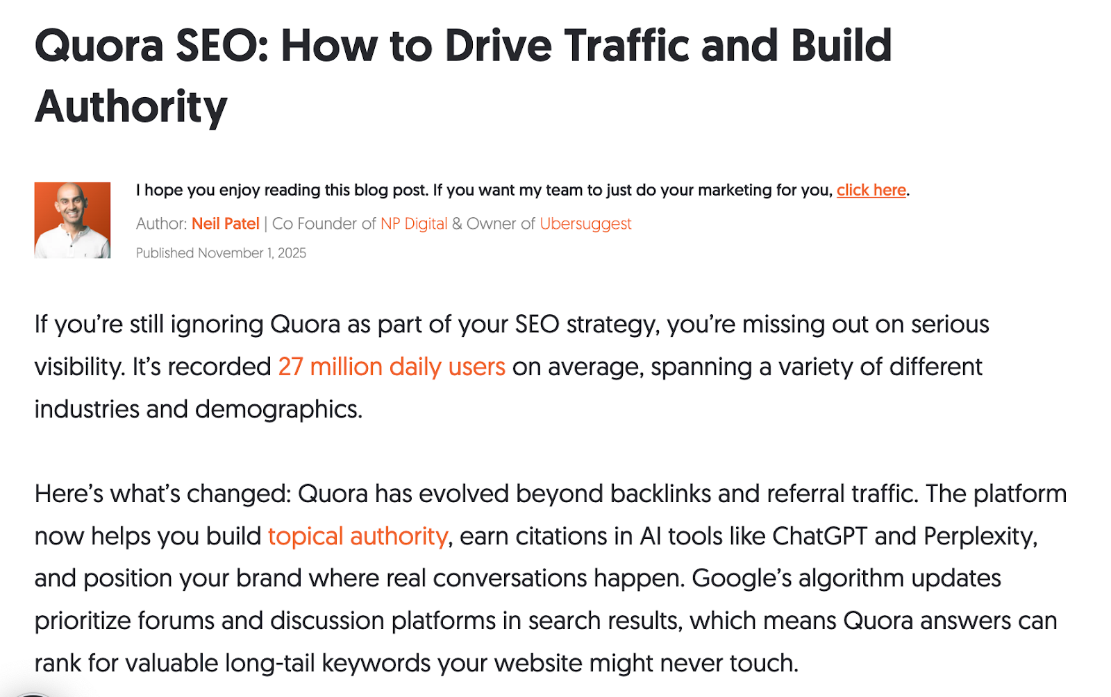Neil Patel is one of the most recognized experts in digital marketing. His take confirms that Quora remains a legitimate and valuable platform for link building, organic visibility, and brand authority.